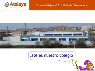 Un grupo de 15 estudiantes y profesores del colegio CEIP Atalaya en Palazuelos de Eresma, Segovia, realizaron un viaje a Extremadura del 23 al 29 de octubre de 2011. El documento presenta fotos e información sobre el colegio, la localización de Segovia y características de la región de Castilla y León, así como imágenes del interior de su colegio.