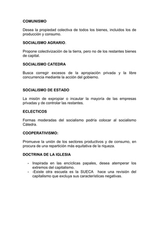 Este documento resume las principales escuelas de pensamiento económico a lo largo de la historia, incluyendo el mercantilismo, la fisiocracia, la escuela clásica, el socialismo y el pensamiento de economistas como Malthus y Keynes. Explica los orígenes, principios y exponentes clave de cada escuela, así como sus visiones sobre temas como el papel del estado, la propiedad privada, el comercio internacional y el crecimiento de la población.