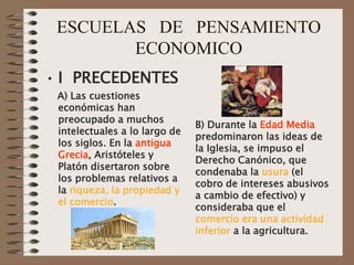 Este documento resume las principales escuelas de pensamiento económico a lo largo de la historia. Comienza con los precedentes en la antigua Grecia y la Edad Media, luego describe el mercantilismo que dominó entre los siglos XVI y XVIII, seguido por la escuela fisiocrática en el siglo XVIII. Luego resume la escuela clásica con Adam Smith, Ricardo, Malthus y Mill, el marxismo, el marginalismo y la escuela austriaca, el keynesianismo y las escuelas posteriores. En resumen, traza la