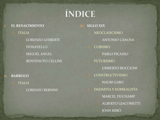 Este documento resume la vida y obras principales de varios escultores importantes de los siglos XV a XX, incluyendo Lorenzo Ghiberti, Donatello, Miguel Ángel, Pablo Picasso y otros. Se divide en secciones por movimiento artístico e incluye información biográfica, descripciones y fotos de obras representativas de cada escultor.