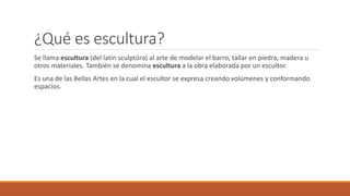 La escultura es el arte de modelar materiales como barro, piedra o madera para crear volúmenes y formas. Se originó hace miles de años cuando el hombre tallaba piedras. Algunos de los escultores más famosos son Miguel Ángel, conocido por obras como el David y la Piedad, y Rodin, reconocido por El pensador. Dos esculturas destacadas que se exhiben en el Museo del Louvre son la Diana de Versalles y la Victoria alada de Samotracia.