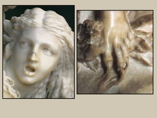 La escultura barroca se caracteriza por la expresión de pasiones y sentimientos dramáticos, el movimiento dinámico y espontáneo, y la atención a detalles como la textura de la piel y la caída de los ropajes. La escultura barroca española se enfoca principalmente en temas religiosos, utilizando materiales como la madera policromada, para expresar un realismo que a veces resulta hiriente. Figuras como el Cristo yacente de Gregorio Fernández muestran un alto grado de detalle an