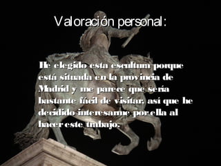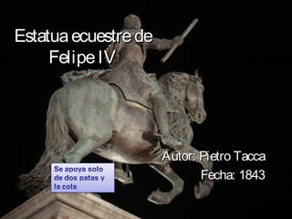 La estatua ecuestre de Felipe IV fue creada en 1843 por el escultor Pietro Tacca. Se encuentra ubicada en la provincia de Madrid y fue seleccionada para este trabajo debido a su ubicación accesible, ya que el autor pensó que sería fácil de visitar.