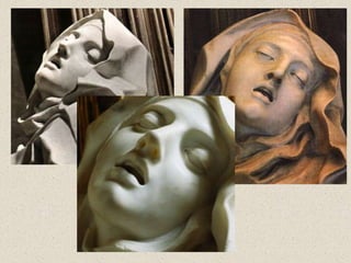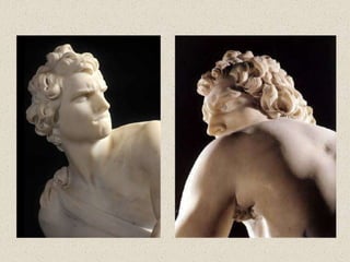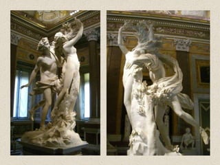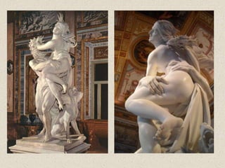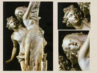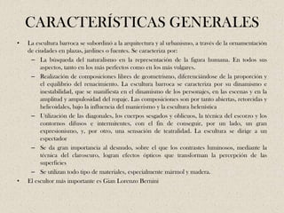 El escultor barroco más importante fue Gian Lorenzo Bernini, quien creó obras dinámicas y teatrales que expresaban emociones. Algunas de sus obras más destacadas incluyen El rapto de Proserpina, Apolo y Dafne y el Éxtasis de Santa Teresa, conocida por su expresividad y combinación de materiales para impactar al espectador. Bernini se formó en Roma y trabajó para varios papas, siendo el principal artista del Barroco romano.