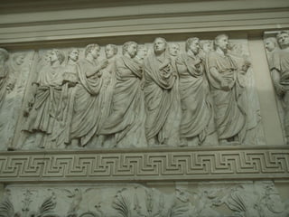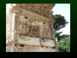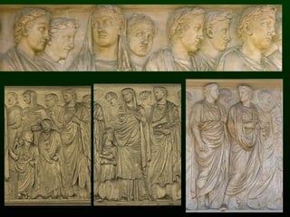 El documento describe la evolución del retrato romano. Los romanos adoptaron el retrato de las culturas etrusca y griega pero lo desarrollaron de forma realista, representando los rasgos individuales de forma fiel. Durante la República, el retrato tenía un sentido privado ligado a las máscaras funerarias. En el Imperio, se usó para ensalzar al Emperador de forma idealizada a veces. Siempre se buscó un equilibrio entre realismo y representación del poder.