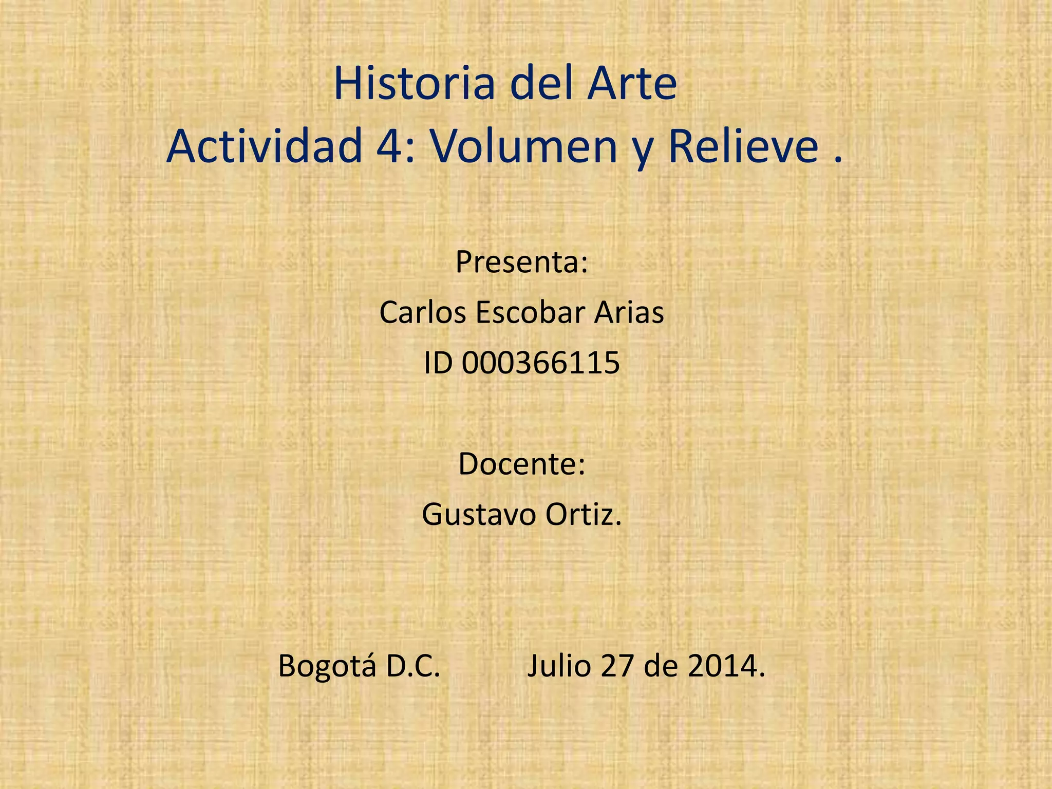 Este documento presenta información sobre la escultura, el volumen y el relieve. Explica que la escultura crea volúmenes al tallar materiales como barro, piedra o madera. Define el volumen como el espacio ocupado por la obra y percibido por los ojos, y el relieve como esculturas tridimensionales sin parte posterior, clasificadas en bajo y alto relieve. Incluye fotografías de obras que ilustran estos conceptos.