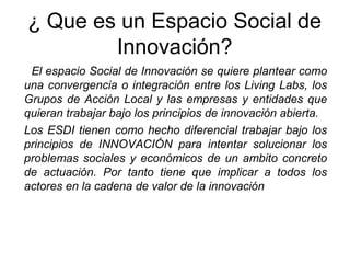 Este documento presenta la propuesta de crear un Espacio Social de Innovación (ESDI) en la región de Maestrazgo para abordar problemas como el envejecimiento y la despoblación mediante la innovación. El ESDI integraría living labs, grupos de acción local y empresas para resolver problemas sociales y económicos a través de la innovación abierta. Se proponen varias fases para el ESDI, incluyendo la gestión empresarial, el marketing de una comunidad de innovación, la innovación medioambiental a través de una fundación, y un canal de