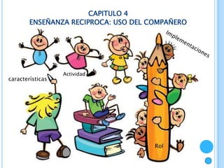 El documento describe la enseñanza recíproca en educación física, donde los estudiantes enseñan a sus compañeros. Explica que los roles del profesor y estudiantes cambian, con los estudiantes tomando responsabilidad por planificar y ejecutar tareas mientras el profesor observa y evalúa. También cubre cómo implementar esta estrategia en diferentes niveles educativos y los tipos de tareas que los estudiantes pueden asignarse mutuamente.