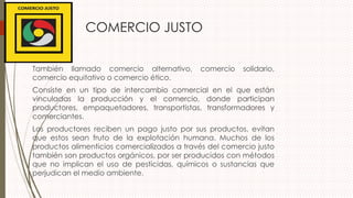 El documento resume el concepto de comercio justo, el cual consiste en un intercambio comercial que garantiza un pago justo a los productores y evita la explotación humana. Explica la trayectoria del comercio justo desde finales del siglo XIX y los organismos internacionales que lo promueven como la WFTO y FLO. También describe brevemente las primeras organizaciones que impulsaron el comercio justo en México y las estrategias utilizadas como tiendas de comercio justo y empresas de comercio justo.