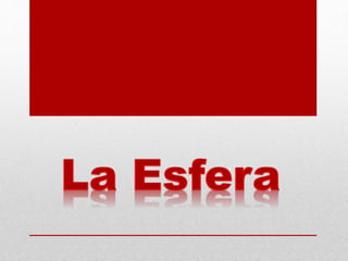 El documento define una esfera como un objeto tridimensional con forma de balón cuyos puntos están equidistantes del centro. Explica que la palabra esfera proviene del griego y latín y significa globo o pelota redonda. Luego describe las características de una esfera incluyendo su centro, radio, cuerda, diámetro y polos. Finalmente, indica que una esfera no tiene caras, aristas ni vértices y que su volumen y área se expresan en función de su radio.