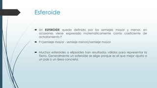 El documento describe cómo la Tierra no es una esfera perfecta debido a la gravedad y variaciones topográficas, sino que tiene la forma de un esferoide achatado. Explica que Newton determinó que debido a la rotación, la Tierra debería ser más ancha en el ecuador que en los polos, con una forma similar a una mandarina. Sin embargo, el astrónomo Cassini concluyó que el ensanchamiento ocurría en los polos en lugar del ecuador, dando a la Tierra una forma más parecida a un pepino.