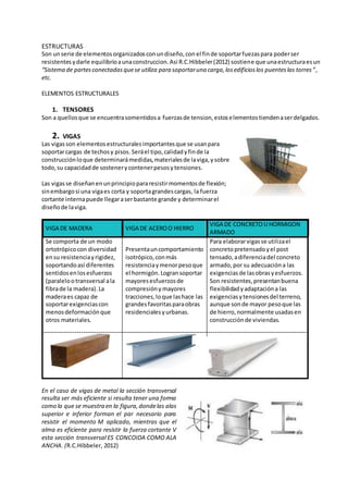 Este documento describe los diferentes tipos de vigas y sus usos en la ingeniería civil. Explica que las vigas son elementos estructurales diseñados para soportar cargas de techos y pisos mediante la resistencia a la flexión. Detalla los diferentes materiales con los que se pueden construir vigas, como madera, acero y concreto armado, y sus propiedades respectivas. También define conceptos como cargas muertas, cargas distribuidas y esfuerzos, los cuales son fundamentales para el diseño estructural de vigas.