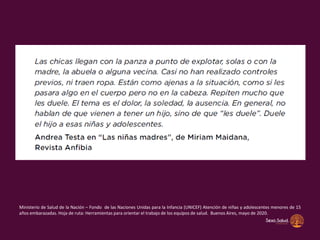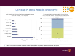 El documento discute la educación sexual integral como una herramienta para prevenir la violencia sexual. Explica que el embarazo en niñas menores de 15 años a menudo es producto de abuso y viola sus derechos. También analiza la magnitud del problema del embarazo adolescente en Argentina y las desigualdades regionales. Resalta la importancia de la educación sexual desde una edad temprana basada en derechos, género y ciencia para favorecer relaciones sexuales seguras y con consentimiento.