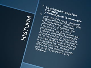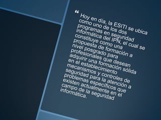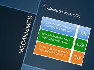 Este documento lista varias áreas relacionadas con la seguridad de la información, incluyendo el análisis de vulnerabilidades, pruebas de penetración, seguridad de redes, sistemas operativos, dispositivos móviles, criptografía, identidad electrónica, protección de datos, gestión de riesgos, políticas y estrategias de seguridad.
