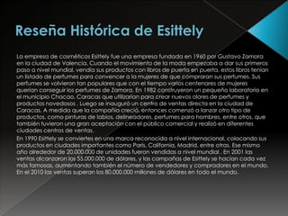 La empresa de cosméticos Esittely fue fundada en 1960 en Valencia, Venezuela por Gustavo Zamora. Inicialmente vendía perfumes de puerta en puerta. En 1982 construyó un pequeño laboratorio en Chacao, Caracas para crear nuevos productos. En 1990 se convirtió en una marca internacional que vendió 20 millones de unidades ese año. Para 2001 sus ventas alcanzaron los $55 millones de dólares y para 2010 superaron los $80 millones a nivel mundial. La misión de Esittely es darle al cliente productos que satisfagan su dese