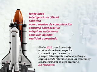 El documento discute los cambios que traerá el año 2020 para los negocios y las carreras profesionales. Algunas de las innovaciones disruptivas que ya están integradas son Google, iTunes y Waze, mientras que otras como Uber, Airbnb y Watson de IBM aún no lo están. Los jóvenes profesionales buscan experiencias internacionales, liderazgo y participar en proyectos innovadores. También esperan empresas innovadoras que se enfoquen en el desarrollo de personas y cumplan con los acuerdos establecidos.