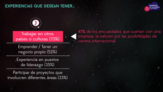 El documento menciona que las personas ven su futuro de forma holística y proyectan logros personales y profesionales. Además, presenta una lista de 20 líderes actuales y pasados.