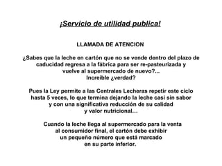 El documento habla sobre la práctica de re-pasteurizar la leche que no se ha vendido antes de su fecha de caducidad hasta 5 veces. Cada vez que la leche es re-pasteurizada, el número en el fondo del cartón aumenta. Se recomienda a los consumidores comprar leche con números 1-3 para asegurar una mejor calidad y valor nutricional, y evitar leche con números 4-5 que ha sido re-pasteurizada varias veces. El documento pide a los lectores que difundan este mensaje para crear conciencia sobre cómo verificar la