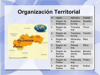 Eslovaquia está dividida en 8 regiones, con una población de 5.4 millones que habla eslovaco. El catolicismo es la religión predominante. Los recursos naturales incluyen minas de oro y el río Váh, mientras que los Montes Tatra son las montañas más altas. El deporte nacional es el hockey sobre hielo.