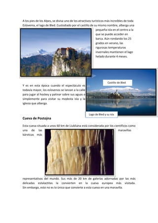 Eslovenia es un país de Europa central ubicado entre Italia, Croacia, Hungría y Austria. Tiene una superficie de 20,273 km2 y una población de 2 millones de habitantes. Algunos de sus principales atractivos naturales son los Alpes Julianos, el lago de Bled y su isla, y la cueva de Postojna con su famoso pez humano. La capital y ciudad más grande es Liubliana.