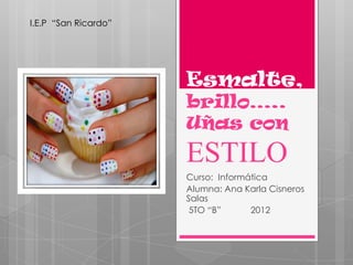 Este documento ofrece una guía sobre diferentes tipos de esmaltes de uñas. Explica brevemente la historia del esmalte de uñas y cómo era usado por las culturas antiguas chinas y egipcias. Luego describe 10 tipos populares de esmaltes de uñas actuales, incluyendo esmaltes metálicos, bicolores, neón, mate, magnéticos, para decorar, glitter, permanentes, fluorescentes y craquelados. Finalmente, proporciona instrucciones detalladas sobre cómo aplicar correctamente el esmalte de u