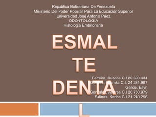 El documento proporciona información sobre la histología del esmalte dental. En resumen: (1) El esmalte es la estructura más dura del diente y está compuesto principalmente de sales minerales; (2) Está formado por unidades estructurales llamadas prismas del esmalte; (3) Su formación (amelogenesis) implica la secreción y mineralización de una matriz orgánica por parte de las células ameloblastos.