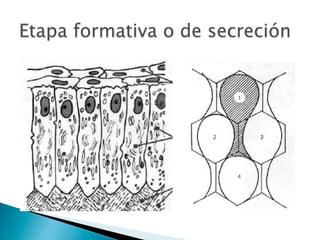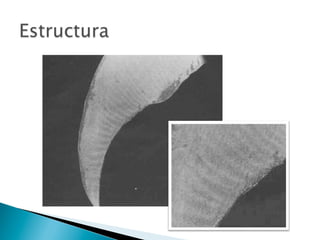 El documento describe la anatomía y el desarrollo del esmalte dental. El esmalte se origina a partir del órgano del esmalte, que deriva del ectodermo bucal. Está compuesto principalmente de cristales de hidroxiapatita y carece de células u otros tejidos vivos. Su estructura en prismas lo hace extremadamente duro pero frágil. Durante el desarrollo dental, el órgano del esmalte, la papila dentaria y el folículo dental forman conjuntamente el germen dental que dará lugar al d