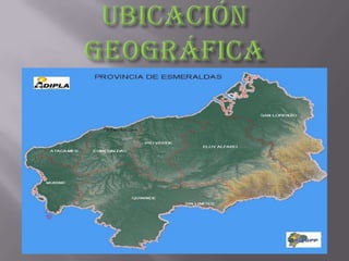 La provincia de Esmeraldas se encuentra en la costa noroccidental de Ecuador. Tiene una extensión de 15,239 km2 y fue provincializada el 18 de noviembre de 1847. Su capital y ciudad más grande es Esmeraldas, conocida como la provincia verde.