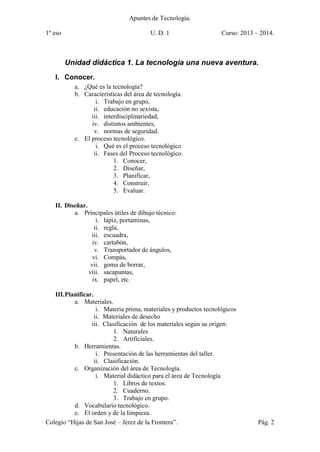 Este documento presenta los apuntes de la unidad didáctica 1 del curso de tecnología para primero de la ESO en el Colegio “Hijas de San José” en Jerez de la Frontera. Incluye información sobre el proceso tecnológico, herramientas de dibujo técnico, componentes de ordenadores, materiales y clasificación de materiales. También describe las características del área de tecnología como el trabajo en grupo, la educación no sexista y la interdisciplinariedad.