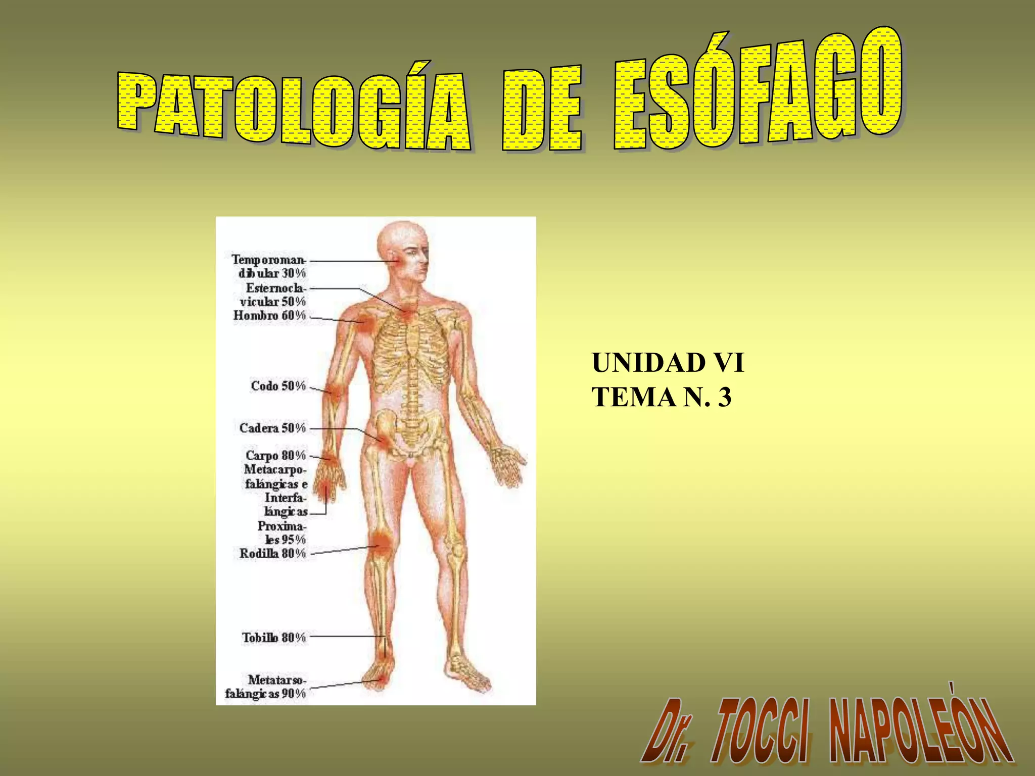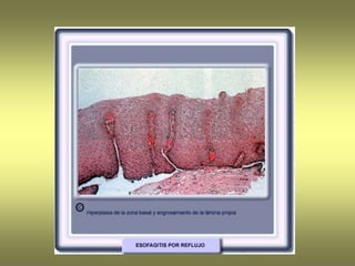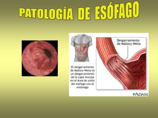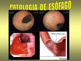 El esófago es un conducto muscular que permite el paso de alimentos y líquidos al estómago. Se describen varios trastornos congénitos y adquiridos que pueden afectar al esófago, incluyendo esofagitis, varices esofágicas, tumores y hernias. El esófago de Barrett es una lesión precancerosa que puede desarrollarse debido a reflujo gástrico crónico.