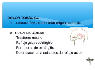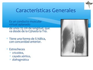 Este documento describe las características del esófago, incluyendo su anatomía, histología, relaciones, irrigación, drenaje venoso, inervación, fisiología de la deglución y síntomas asociados. También describe las causas más comunes de disfagia orofaríngea y esofágica, así como los trastornos motores primarios del esófago, en particular la acalasia.