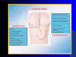 Este documento describe la anatomía del esófago y el estómago. Explica que el esófago es un tubo muscular de aproximadamente 20-25 cm que conecta la faringe con el estómago, pasando a través del tórax y el diafragma. Describe las porciones, estrangulamientos, esfínteres, histología, irrigación sanguínea y relaciones anatómicas del esófago. Luego, explica que el estómago tiene forma de J y una capacidad de 1000 cm3, e incluye detal