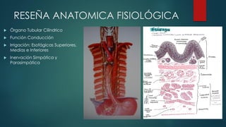 El documento proporciona información sobre el esófago, incluyendo su anatomía, fisiología, trastornos motores y su tratamiento. Define varios trastornos como la acalasia, el espasmo esofágico difuso y la relajación incompleta del esfínter esofágico inferior. Describe la manometría como la prueba estándar de oro para evaluar los trastornos motores y el tratamiento quirúrgico como el enfoque principal para la acalasia.