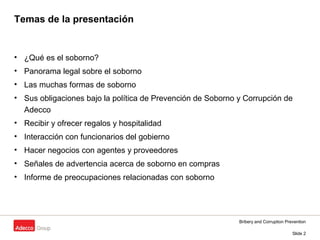 Este documento presenta una capacitación sobre prevención de soborno y corrupción para empleados del departamento de compras. Cubre temas como qué es el soborno, las leyes contra el soborno, formas comunes de soborno, políticas de la empresa sobre regalos y hospitalidad, interacción con funcionarios del gobierno, proveedores y agentes, señales de advertencia de soborno, e instrucciones para reportar sospechas de soborno. El objetivo es crear conciencia sobre los riesgos de soborno y asegurar el cumplimiento de las leyes