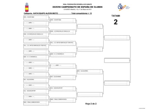 Este documento contiene los resultados de varias categorías de competiciones de kata y kumite en el Campeonato de España de Clubes de Karate. Incluye las listas de participantes de 13 equipos alevines de kata mixto, 17 equipos infantiles de kata mixto, 21 equipos juveniles de kata mixto, 18 equipos cadetes de kata mixto, 15 equipos senior masculinos de kata, 12 equipos senior femeninos de kata y 26 equipos juveniles mixtos de kumite.