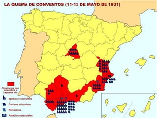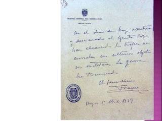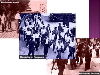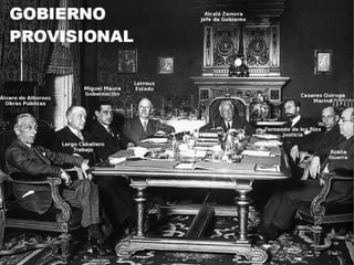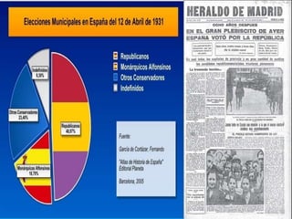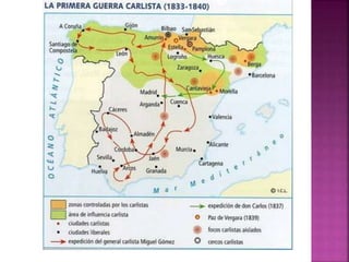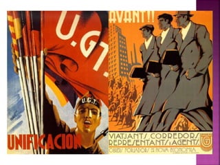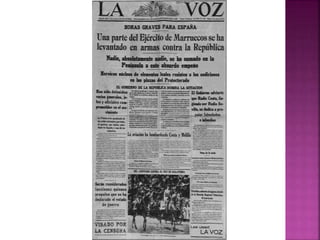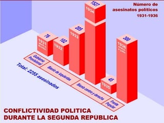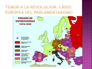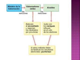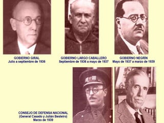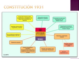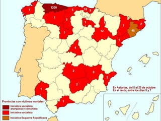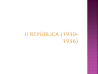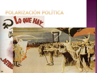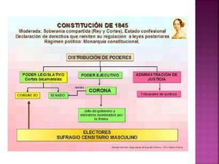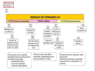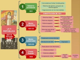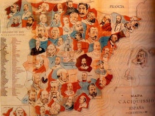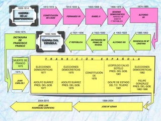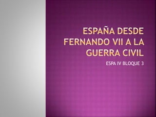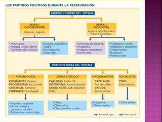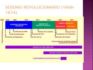 El documento resume los principales periodos políticos de España desde la muerte de Isabel II en 1868 hasta el final de la Guerra Civil en 1939. Estos incluyen el Sexenio Revolucionario tras la revolución de 1868 que derrocó a Isabel II, la Restauración borbónica con Alfonso XII y XIII, la Dictadura de Primo de Rivera, la Segunda República y la Guerra Civil española.