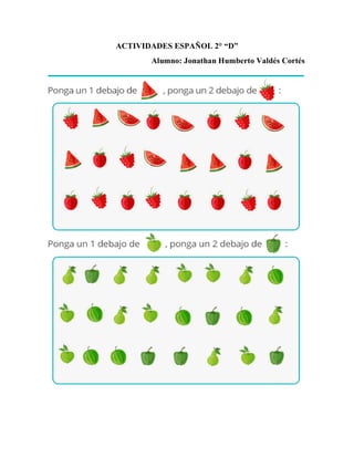 El documento presenta un ejercicio de actividades en español para el segundo grado donde se pide al alumno Jonathan Humberto Valdés Cortés que repita patrones en recuadros y encuentre las diferencias entre dos imágenes anotándolas.