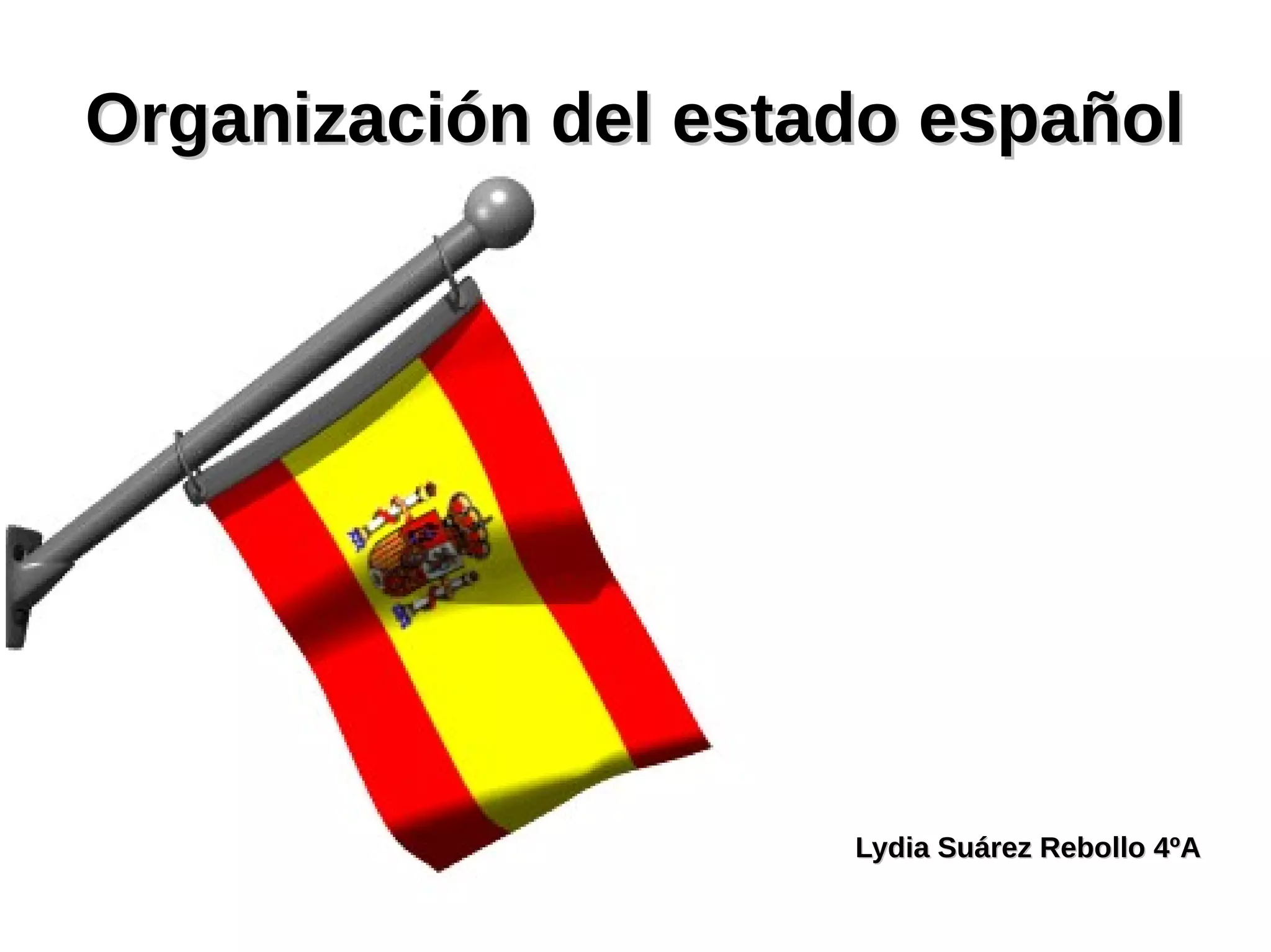 Este documento resume la organización del estado español. Está compuesto por tres poderes: legislativo (Congreso y Senado), ejecutivo (Gobierno) y judicial (Tribunal Supremo y otros jueces). El Rey es el jefe de estado y sus actos deben ser refrendados por el presidente del gobierno u otros ministros competentes. El castellano es el idioma oficial pero otras lenguas como el catalán también son oficiales en sus respectivas comunidades autónomas.