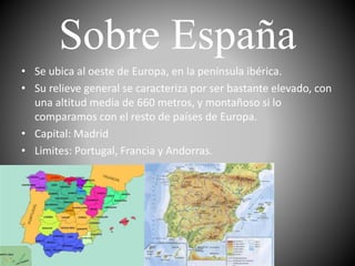 España se ubica en la península ibérica de Europa occidental. Tiene un relieve montañoso y un clima diverso, predominando el mediterráneo. Su capital es Madrid y limita con Portugal, Francia y Andorra. El documento también proporciona detalles biográficos sobre el poeta español Federico García Lorca, nacido en Granada en 1898.