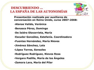 Este documento presenta información sobre las comunidades autónomas de España. Explica que España está dividida en 19 comunidades autónomas, cada una con su propio estatuto y gobierno. Brevemente describe algunas características de Galicia, Asturias y Cantabria, incluyendo detalles sobre su cultura, gastronomía e historia. También incluye algunas actividades para repasar los conceptos clave sobre la organización política y territorial de España.