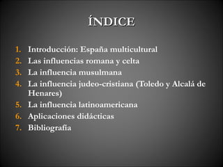 España ha sido influenciada por muchas culturas a lo largo de su historia, incluyendo la cultura romana, celta, musulmana, judía y cristiana. La cultura musulmana dejó una gran huella en España durante los 8 siglos que gobernaron el país, influyendo la arquitectura como la Alhambra y la Mezquita de Córdoba, así como la gastronomía y el vocabulario. Otras influencias importantes incluyen la cultura judía en ciudades como Toledo y Alcalá de Henares, donde judíos