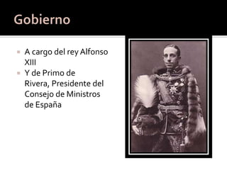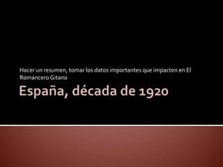 El documento resume el contexto político y social de España en la década de 1920. En 1923, Primo de Rivera dio un golpe de estado e instauró una dictadura militar que suspendió la constitución y disolvió los partidos políticos. Aunque inicialmente contó con apoyo, la oposición creció hasta forzar su dimisión en 1930, dando paso a la Segunda República española.