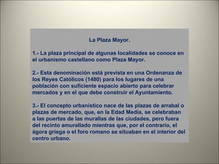 La Plaza Mayor es la plaza principal de algunas localidades castellanas según una ordenanza de los Reyes Católicos de 1480. Surge de las plazas medievales de mercado fuera de las murallas de las ciudades, a diferencia del ágora griega o el foro romano que estaban dentro. La Plaza Mayor suele albergar el ayuntamiento y ser el centro cívico y comercial de la localidad.