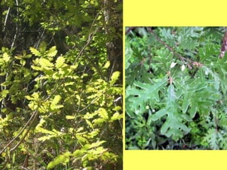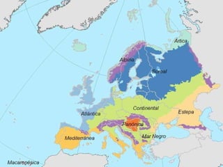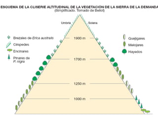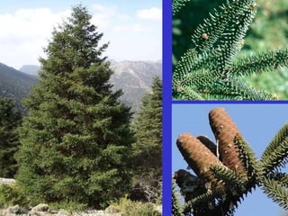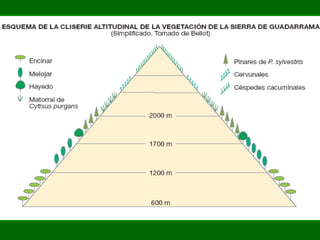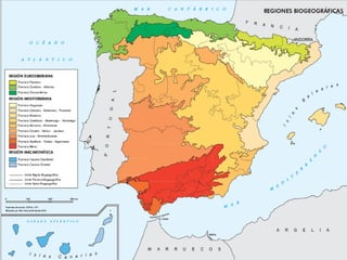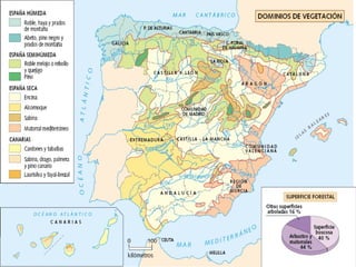 España tiene varios tipos de paisajes vegetales, incluyendo bosques, matorrales y alta montaña. Los bosques se dividen en perennifolios y caducifolios y contienen especies como hayas, robles, castaños, melojos, quejigos, pinos y eucaliptos. Los matorrales incluyen encinas, alcornoques y tabaibas. La alta montaña se divide en varios pisos que van de los nivales sin vegetación permanente hasta los basales y montanos con coníferas.