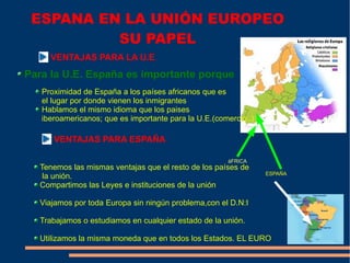 Este documento describe la importancia de España en la Unión Europea y los beneficios de la pertenencia de España a la UE tanto para España como para la UE. Para la UE, España es importante debido a su proximidad a África y por compartir el idioma español con los países de América Latina. Para España, los beneficios incluyen compartir las leyes e instituciones de la UE, viajar libremente por Europa y trabajar o estudiar en cualquier estado miembro.