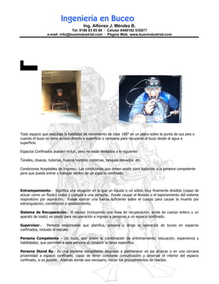 Este documento describe los procedimientos para realizar buceo de manera segura en espacios confinados como tuberías, tanques y cisternas. Define términos como espacio confinado y entrampamiento. Explica los roles del supervisor, buzo competente y personal de apoyo. Detalla los equipos, entrenamiento, análisis de riesgos y medidas de seguridad requeridas como parte de la operación de buceo en espacios confinados.