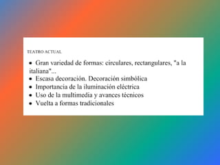 El documento presenta una breve introducción al teatro actual, incluyendo una sección sobre el teatro griego, las partes del teatro griego, los orígenes y evolución del teatro medieval y el corral de comedias, con una actividad relacionada.