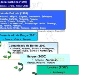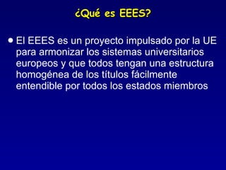 El documento describe el Espacio Europeo de Educación Superior (EEES), que armoniza los sistemas universitarios europeos. Introduce el crédito ECTS, grados de 3 años, másteres y doctorados. Establece titulaciones comparables y un suplemento al título para facilitar la movilidad. Los objetivos son promover oportunidades laborales, competitividad y necesidades del mercado laboral.