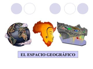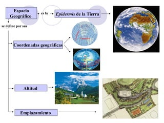 El documento describe el concepto de espacio geográfico y su importancia para comprender el mundo actual. Define el espacio geográfico como determinado por coordenadas, altitud y ubicación, y moldeado por la interacción entre seres humanos y el medio ambiente. Explica que el espacio geográfico es diverso, cambiante y está en constante evolución debido a las necesidades humanas y recursos. También discute las perspectivas determinista y posibilitadora sobre la relación entre seres humanos y medio ambiente. Finalmente, analiza cómo el