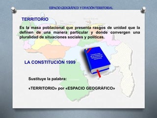 El documento analiza el concepto de espacio geográfico y la división territorial en Venezuela, enfatizando la importancia de la soberanía territorial según la Constitución de 1999. Se abordan principios como el 'utis possidetis iuris' y la territorialidad, así como la inviolabilidad de las sedes diplomáticas. Además, se menciona la controversia limítrofe de Venezuela con sus países vecinos y las implicaciones legales de los tratados relacionados.